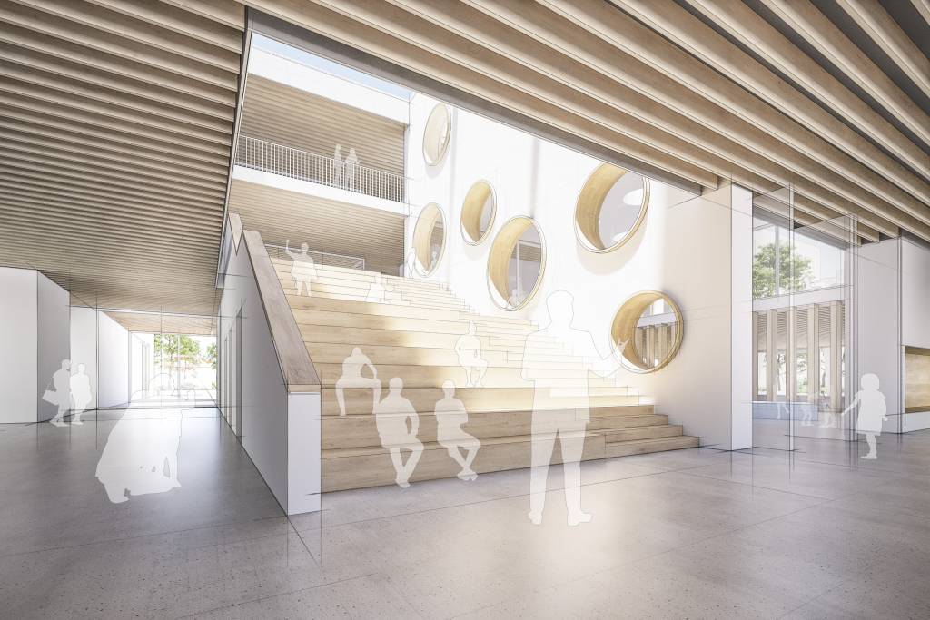 Als zentrales Erschließungs- und Aufenthaltselement bildet die großzügige Halle das Herzstück des Gebäudes. Die Perspektive zeigt die räumlichen Bezüge zwischen Foyer, Galerie und Haupterschließung. Natürliches Licht betont die Höhe des Luftraums und unterstreicht die zentrale Bedeutung der breiten Stufenanlage als Ort der Begegnung und des Austauschs.